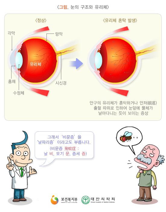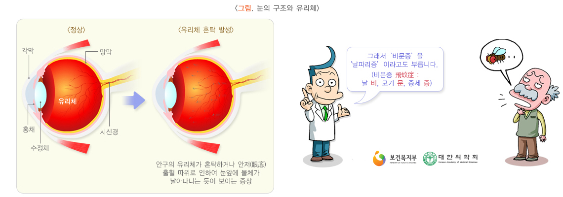 ³ëÈ·Î ÀÎÇØ Á© ¼ººÐÀÌ ¹°·Î º¯ÇÏ°Ô µÇ´Â À¯¸®Ã¼¾×Ȱ¡ ÁøÇàÇϸé Åõ¸íÇÑ À¯¸®Ã¼ ¾È¿¡ ȥŹÀÌ »ý±é´Ï´Ù. ÀÌ È¥Å¹Àº ¹àÀº °÷¿¡¼ ±×¸²ÀÚ¸¦ »ý±â°Ô ÇÏ¿© ¸¶Ä¡ ¸ð±â³ª ³¯ÆÄ¸®°¡ ³¯¾Æ´Ù´Ï´Â °Íó·³ º¸ÀÌ°Ô µÇ¾î À̸¦ ºñ¹®Áõ ¶Ç´Â ³¯ÆÄ¸®ÁõÀ̶ó ºÎ¸¨´Ï´Ù. ¶ÇÇÑ, À¯¸®Ã¼ÀÇ ¿ëÀûÀÌ ÁÙ¾îµé¸é ½Å°æ¸Á¸·À¸·ÎºÎÅÍ À¯¸®Ã¼°¡ ¶³¾îÁö°Ô µÇ´Âµ¥ ÀÌ ¶§ ¶³¾îÁö·Á´Â ÈûÀÌ ½Å°æ¸Á¸·À» ÀÚ±ØÇÏ¸é ¹ø°³°¡ Ä¡µí ºûÀÌ ¹øÂ½°Å¸®´Â ±¤½ÃÁõÀ» À¯¹ßÇÏ°Ô µË´Ï´Ù.